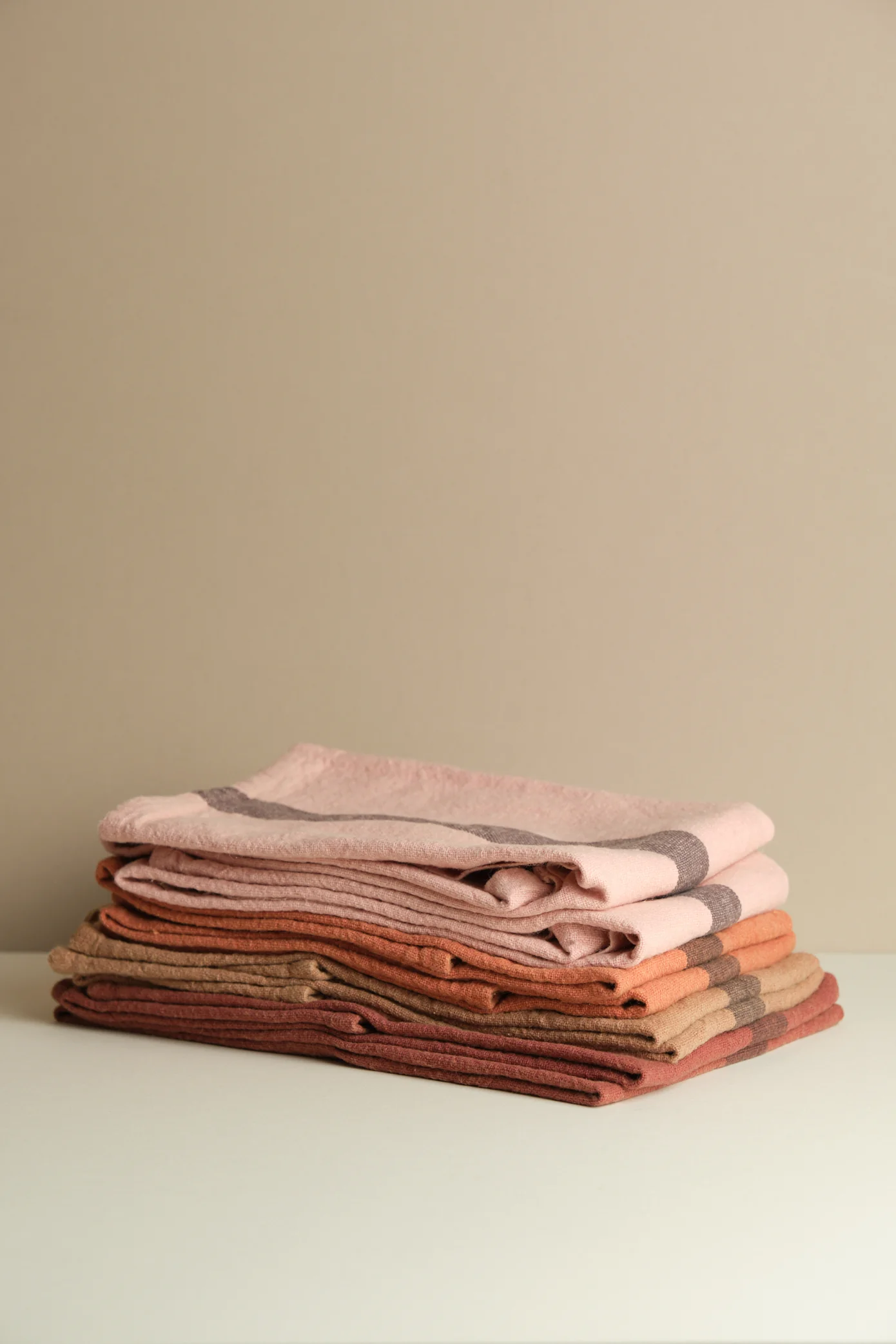 A thick rustic linen tea towel - available in shades of pink, brown, or terracotta hues.