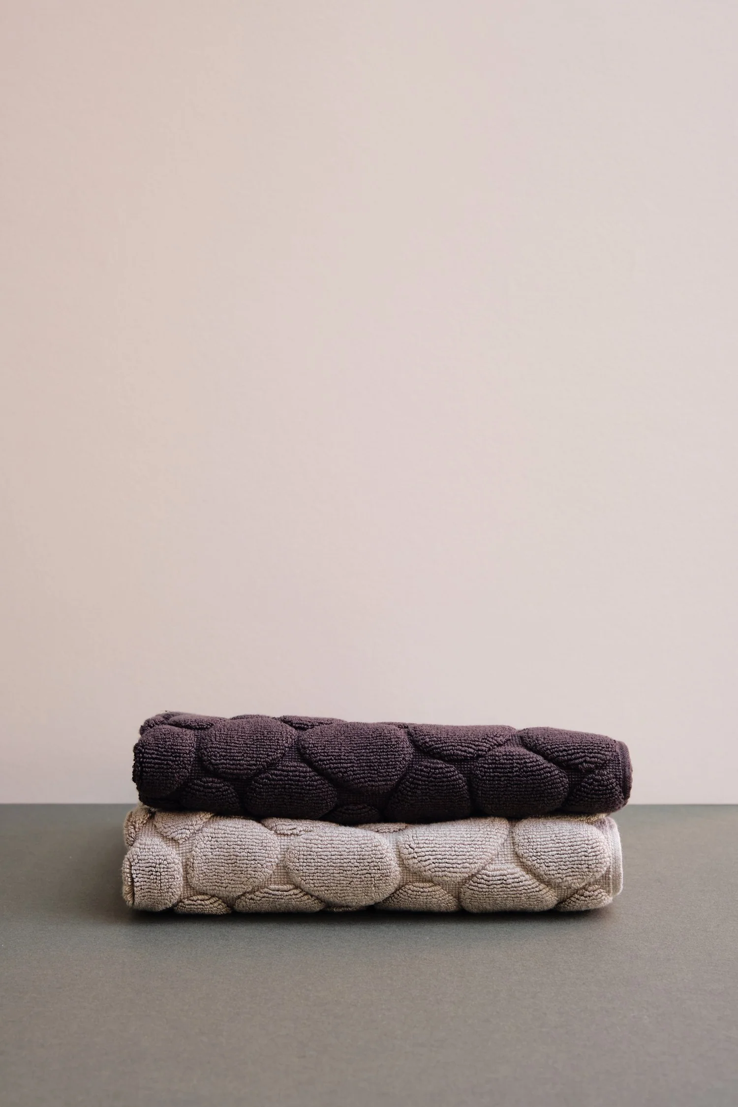 Made by Yoshii Towel in Imabari, Japan, these pebble stone bath mats are padded and designed to be reminiscent of the smooth pebbles next to waterfronts in the natural world. Made from a dark grey, soft cotton fabric which not only feels great underfoot but is also very absorbent and quick drying.
