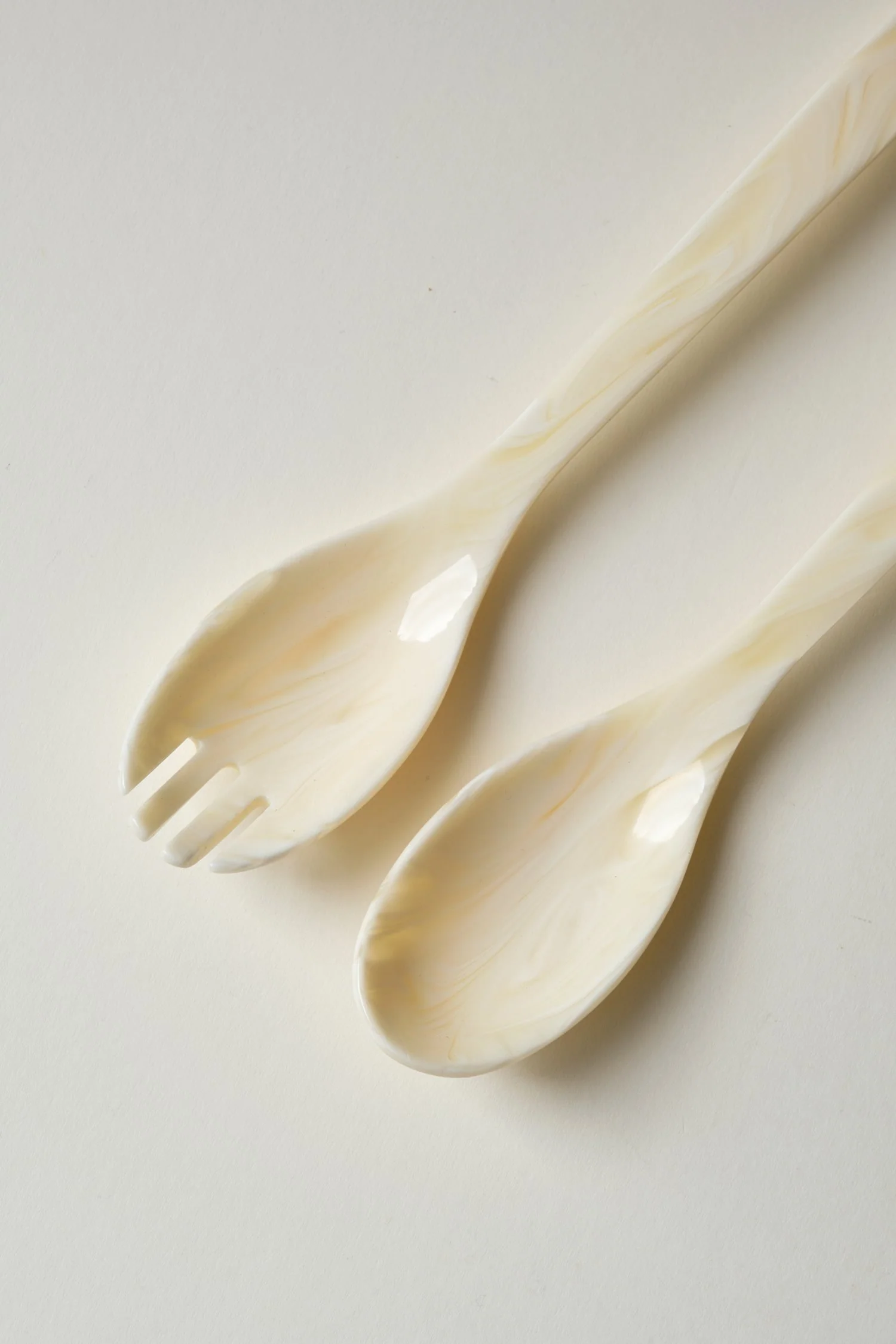These ivory salad servers make a beautiful pair for serving up serving dishes at the table. Made from a pearlescent ivory acrylic. Sold as a pair.