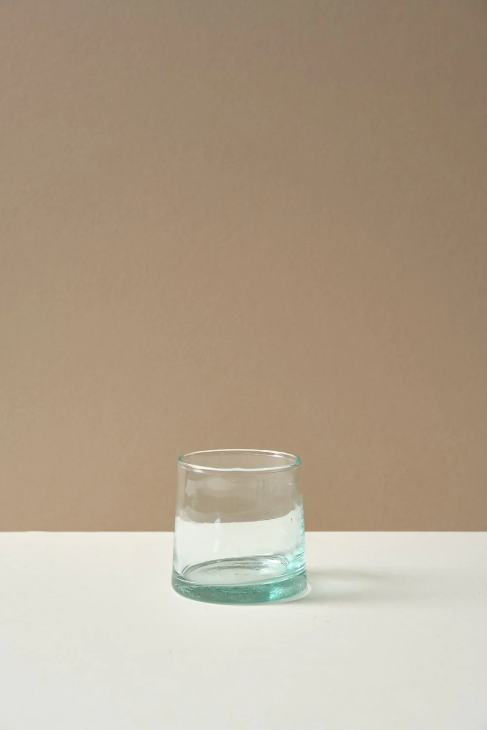 The low tumblers are an ideal size for a glass of wine, whiskey or a cup of juice. Handmade from recycled glass and sold as a set of four.
