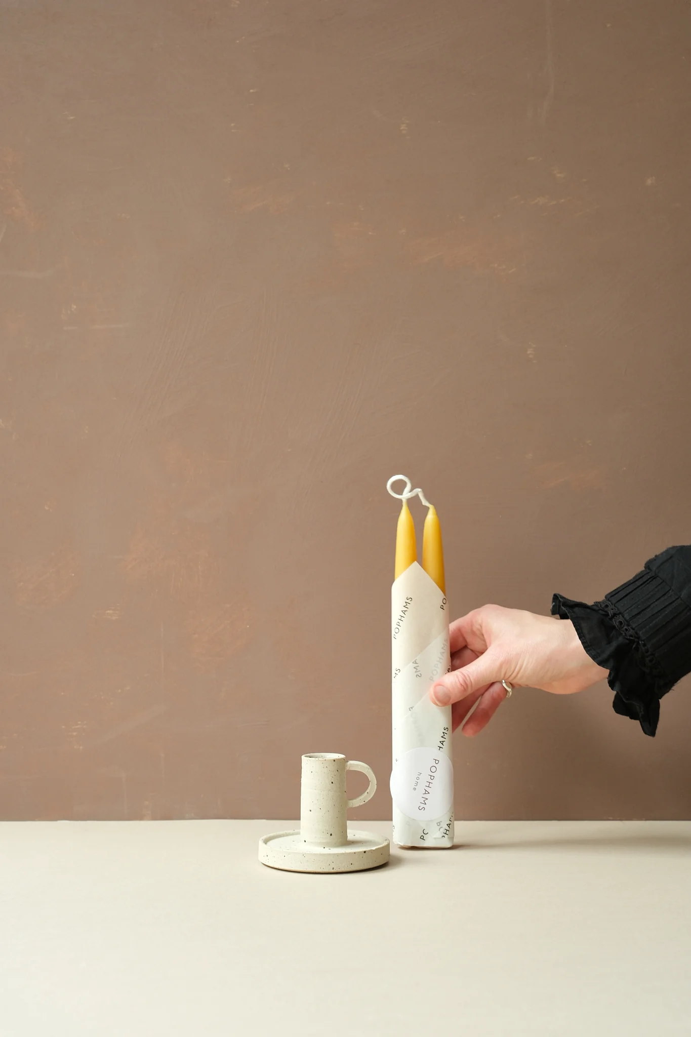 Simple in design, these minimalist candlesticks let their natural speckled clay finish do all the talking. Featuring a wide base, unglazed outer and glazed inner. We recommend pairing with our beeswax candles.