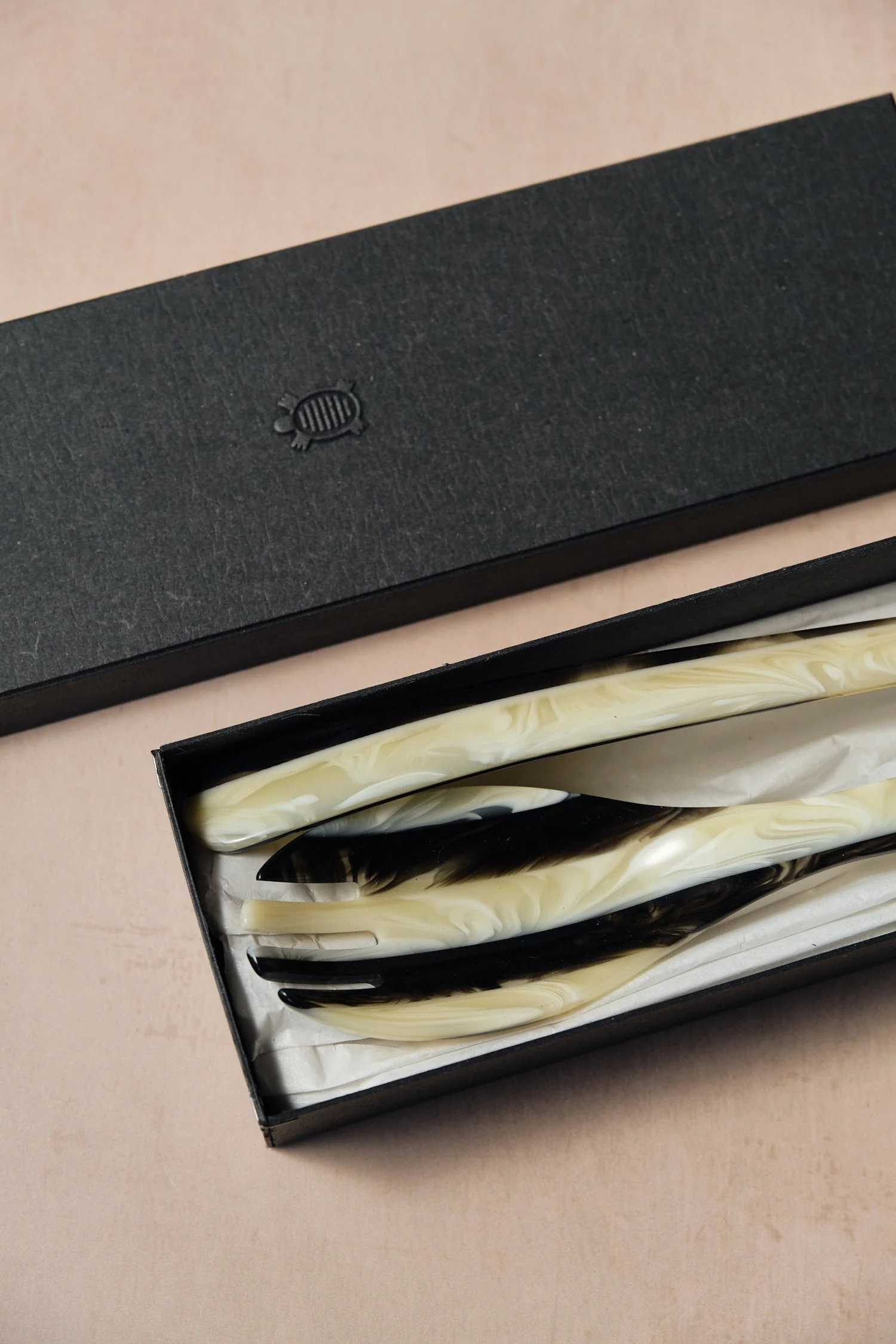 These striped salad servers make a striking pair for serving up serving dishes at the table. Made from a marbled, slightly pearlescent cream and black acrylic. Sold as a pair.