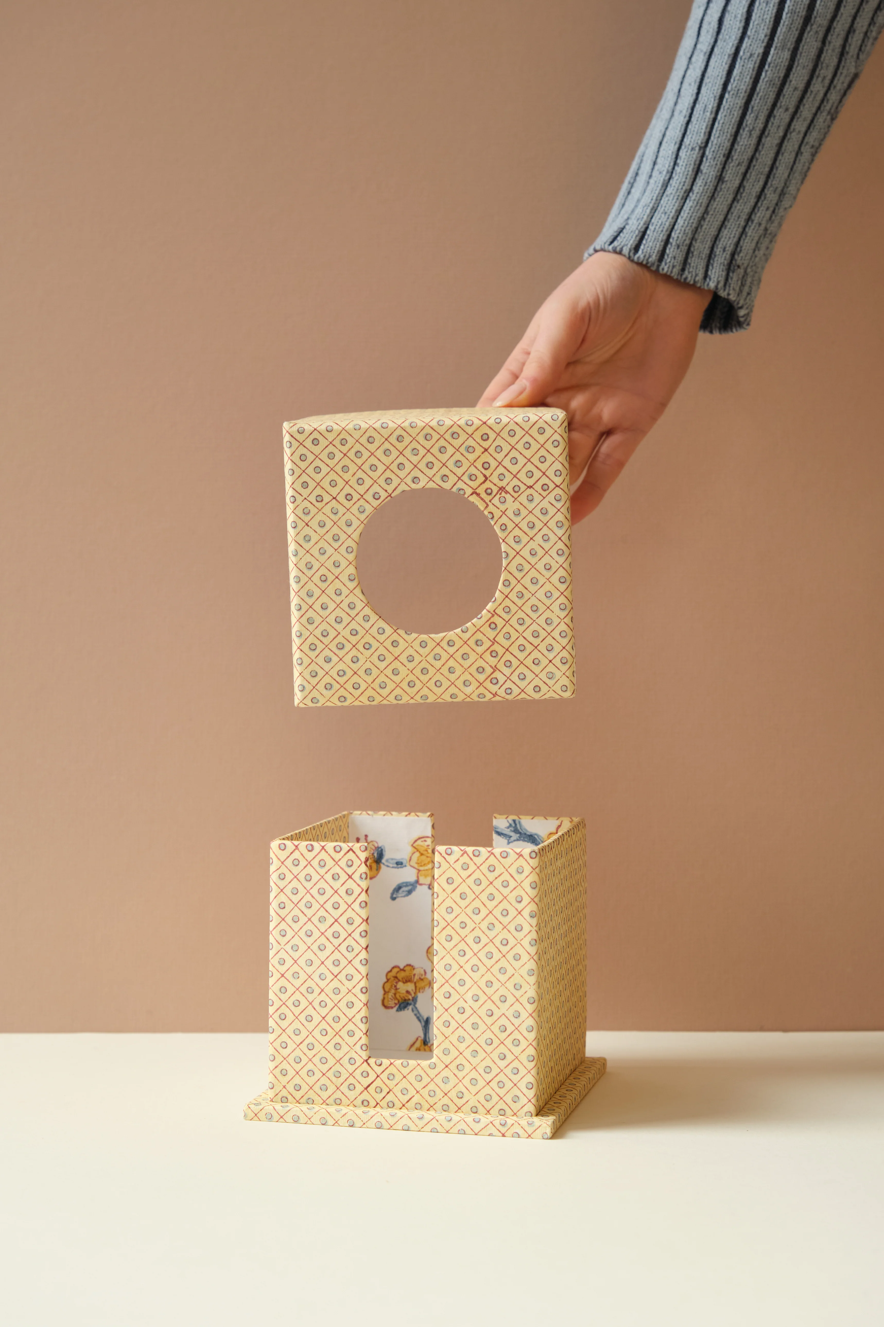 Add a touch of style and functionality to your space with this beautifully designed patterned tissue box. Made using hand block printed paper in India.